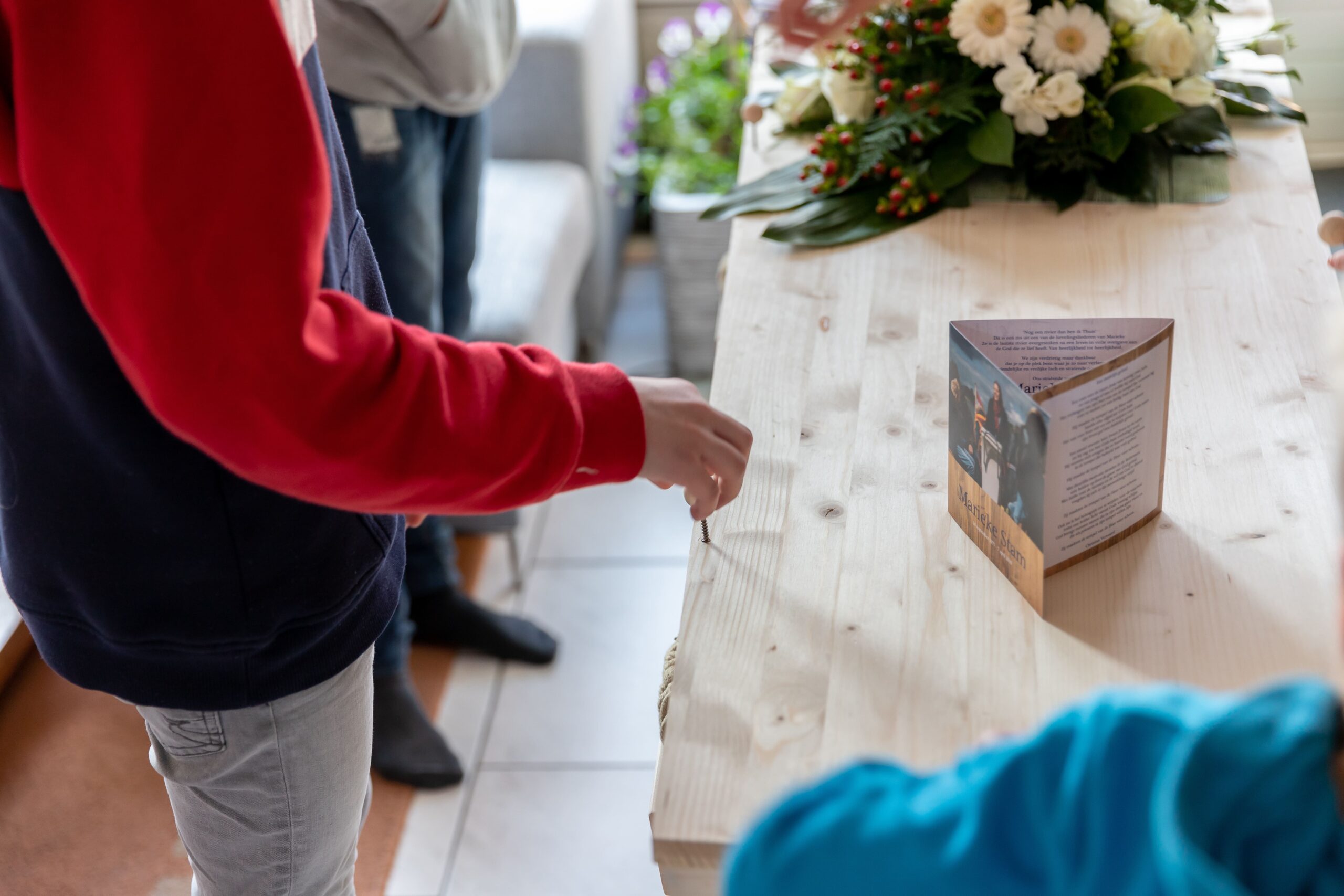 De uitvaart vond plaats in de Trinitatiskapel in Dordrecht. De kapel is van zichzelf al wit, licht en ruimtelijk. Nienke heeft vervolgens met haar team de kapel nog verder aangekleed met kaarsjes, bloemen en een veranderde opstelling: om de kist heen stonden acht stoelen voor de familie en de andere stoelen waren rond tafeltjes gezet. Nienke: ‘Het zag er allemaal erg sfeervol uit. Er was daarnaast achtergrondmuziek (verzorgd door www.bestebands.nl) en er stonden hapjes van Dordrechtse cateraar In de Vergulde Lampet klaar. Ook had iedere genodigde een bloem meegenomen die een bloemist, Mila-Flora, ter plekke samenbracht tot een kleurrijk rouwboeket. Dat mensen fysiek afstand hielden, betekende hierdoor niet dat de uitvaart ook afstandelijk werd. Integendeel. Het was warm en sfeervol. Het was een eer om te mogen organiseren en mee te maken.’ Een dag later heeft de familie in heel kleine kring nog een keer afscheid genomen. Daarna zijn zij naar het crematorium gegaan. ‘Daar hebben de kinderen nog een heliumballon opgelaten. De cirkel was rond.’